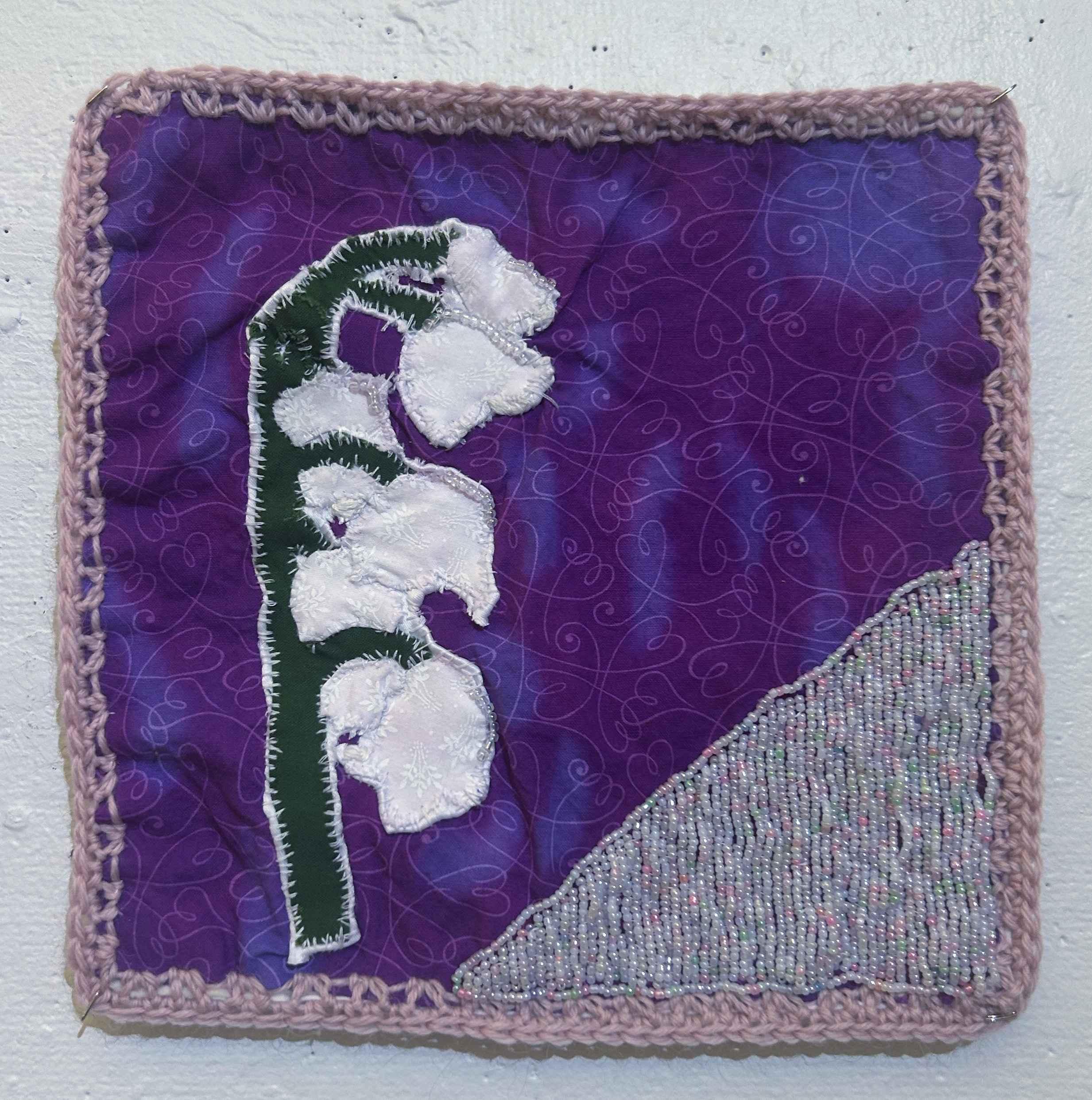 Hand stitched, hand quilted. Fabric, yarn, thread