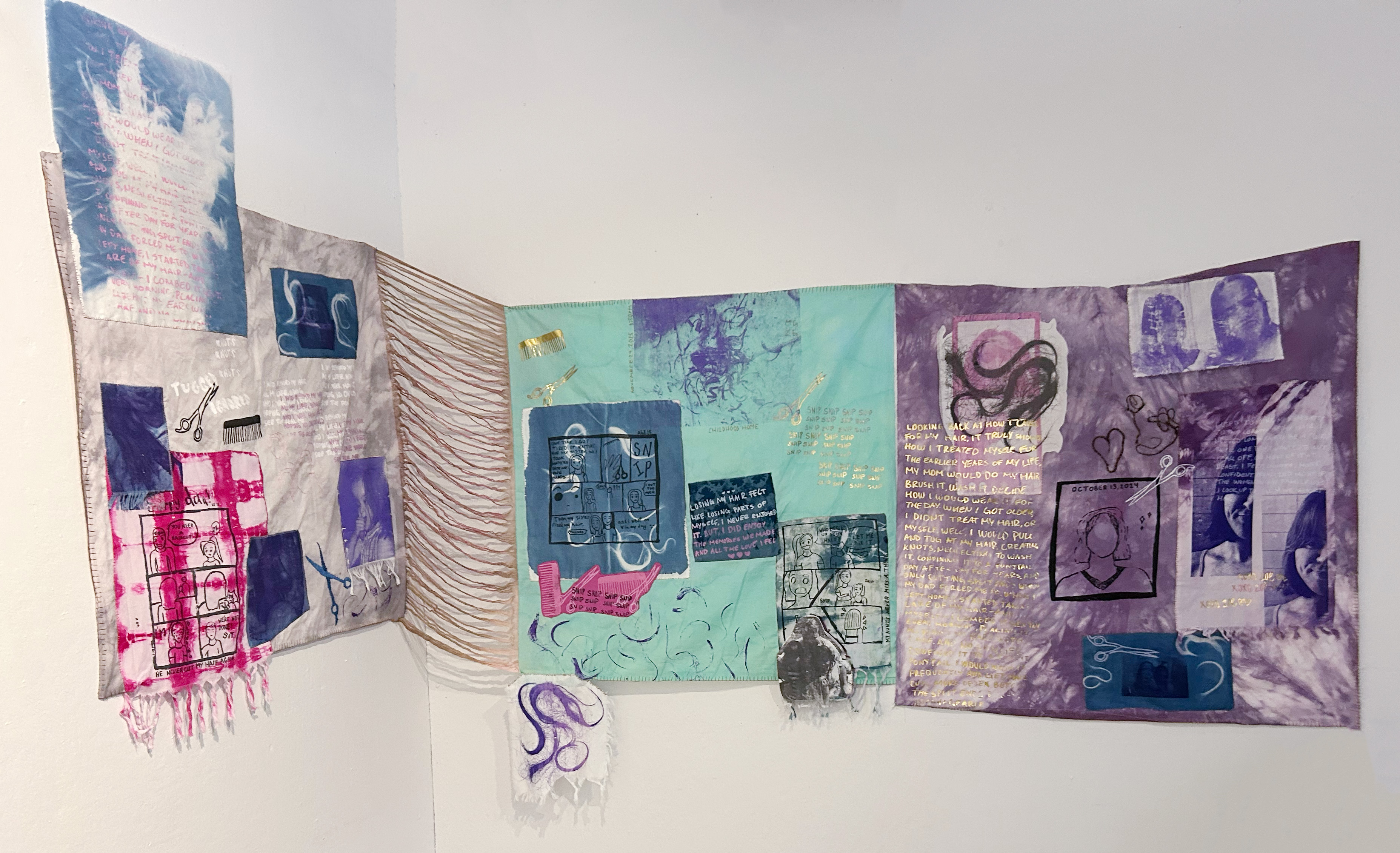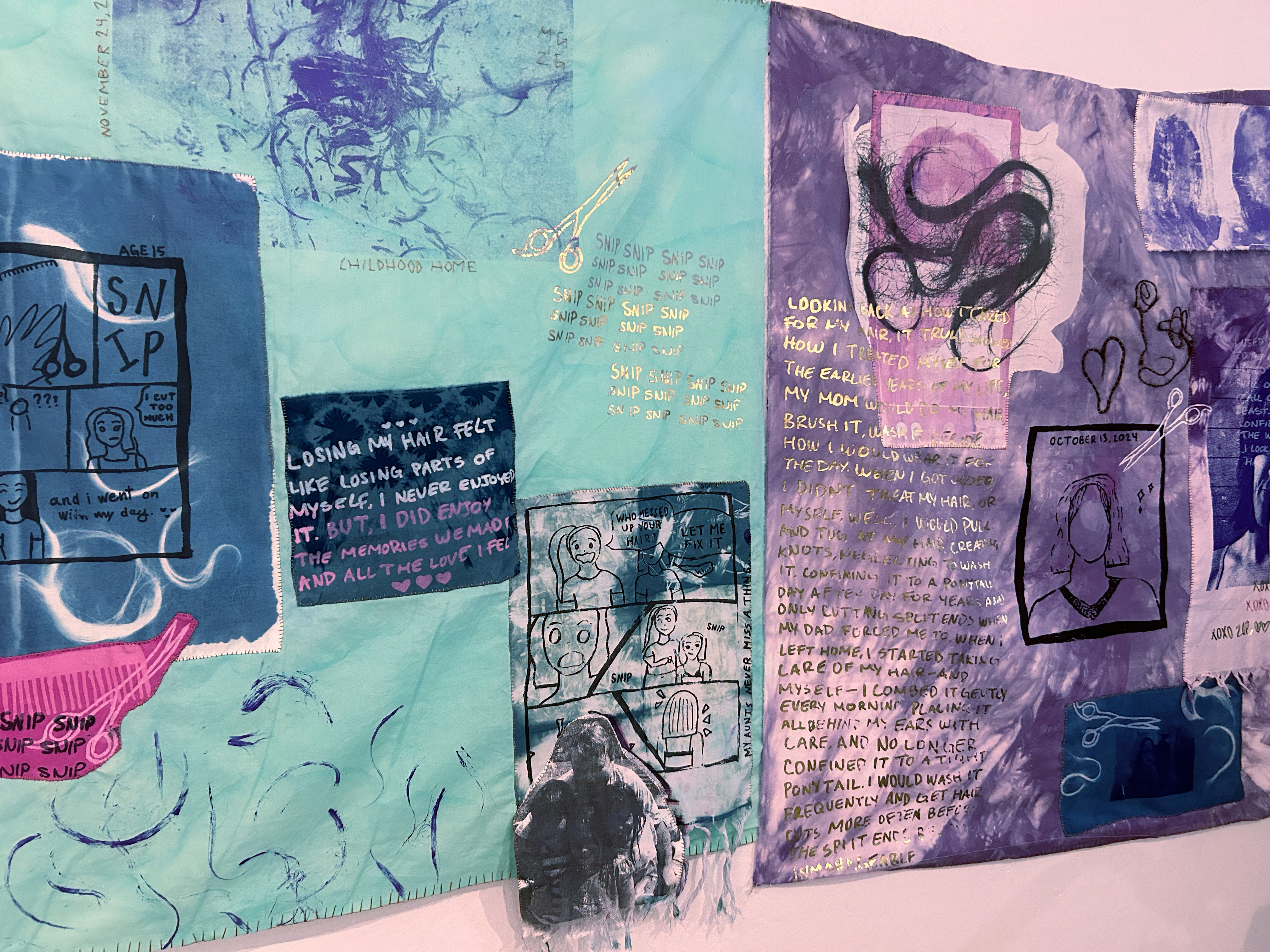 Through this work, I wanted to explore my experience with hair cuts in domestic spaces with family. A tradition within my family is cutting our own hair. For most of my life, I wished to be like all the other kids and go to a salon to get haircuts, but as I got older, I cherished the time and love that my family put into haircuts. Using cyanotyping, stamping, screen printing, and embroidery, I wanted to portray my weird relationship with hair, how I felt about getting my hair cut, and the freedom I feel now, expresing myself through my hair.