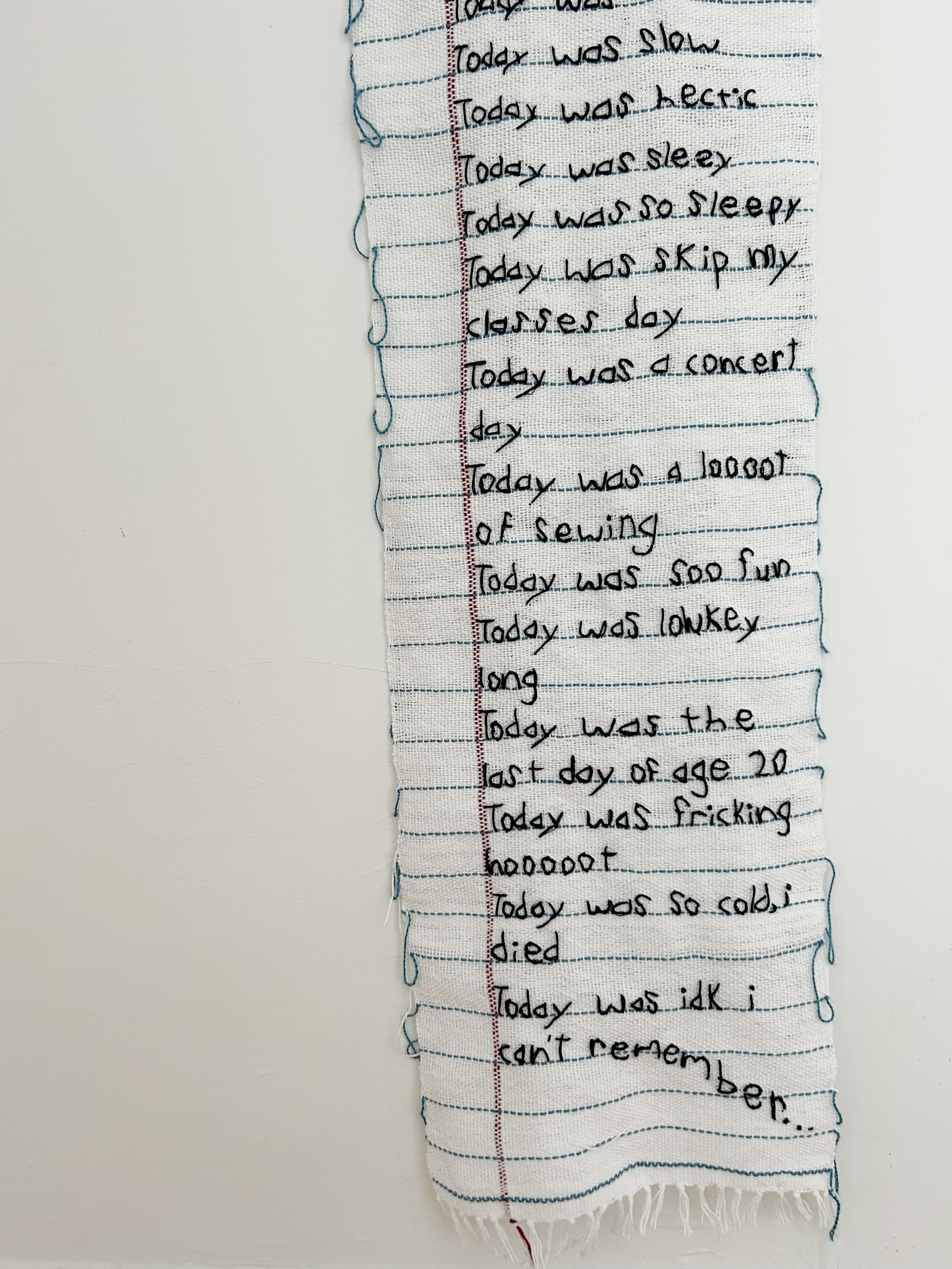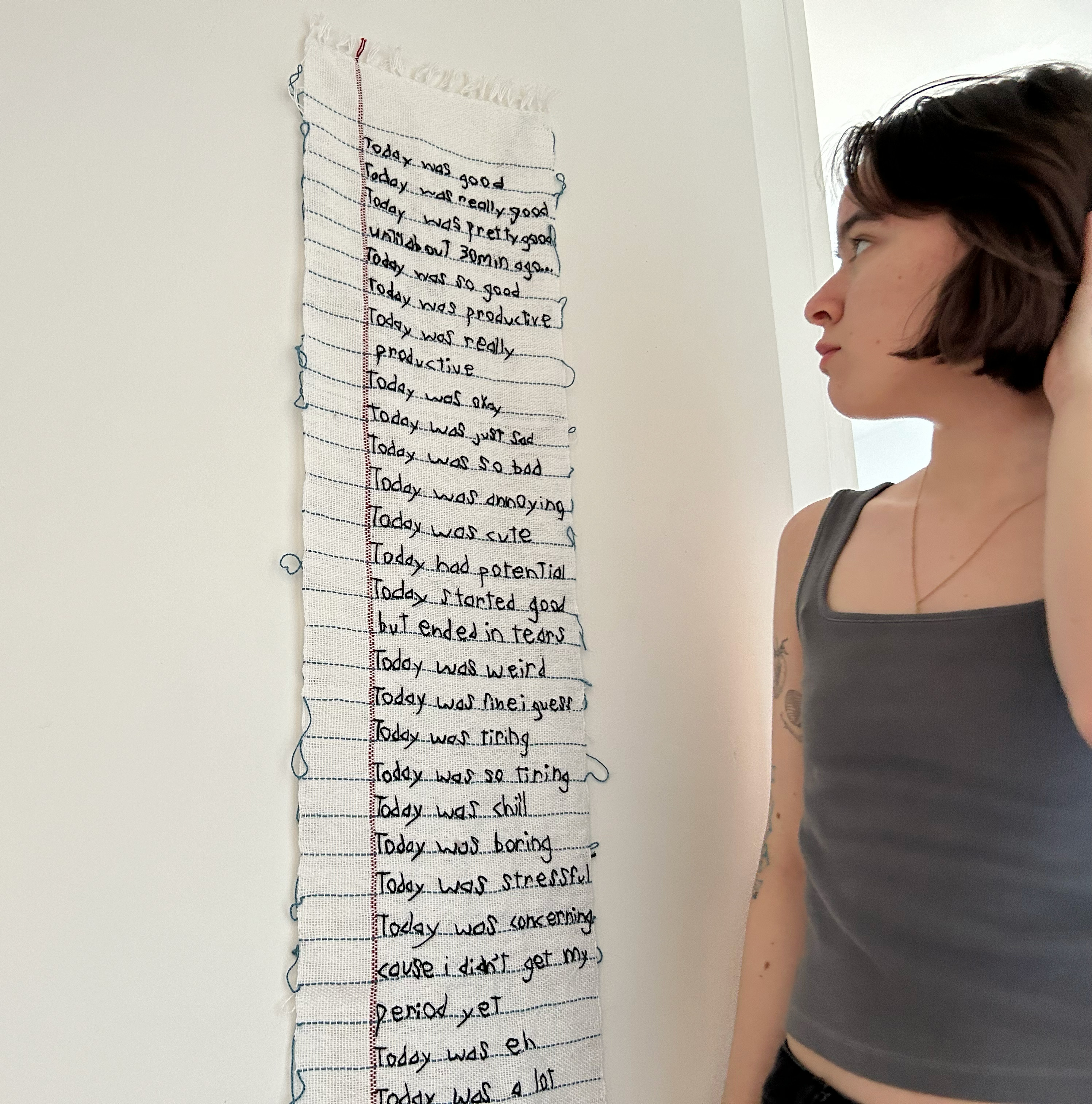 Using the first line in each of my journal entries, I created this weaving to show the variety within my daily life. Making something so personal into a permanent form felt freeing. I made the length of the weaving my height.